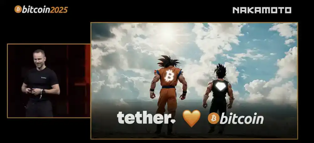 在 2025 年比特币大会的舞台**,Tether **执行官 Paolo Ardoino 站在一幅悟空形象前表示,「比特币是我的悟空,是我们的朋友。」