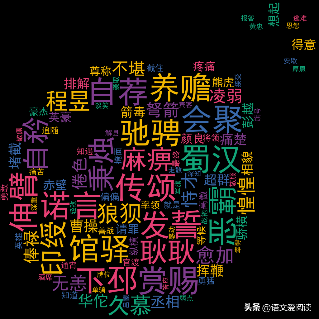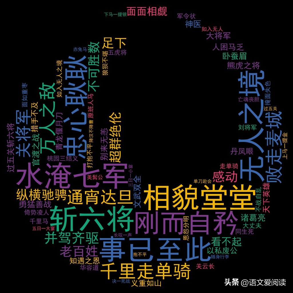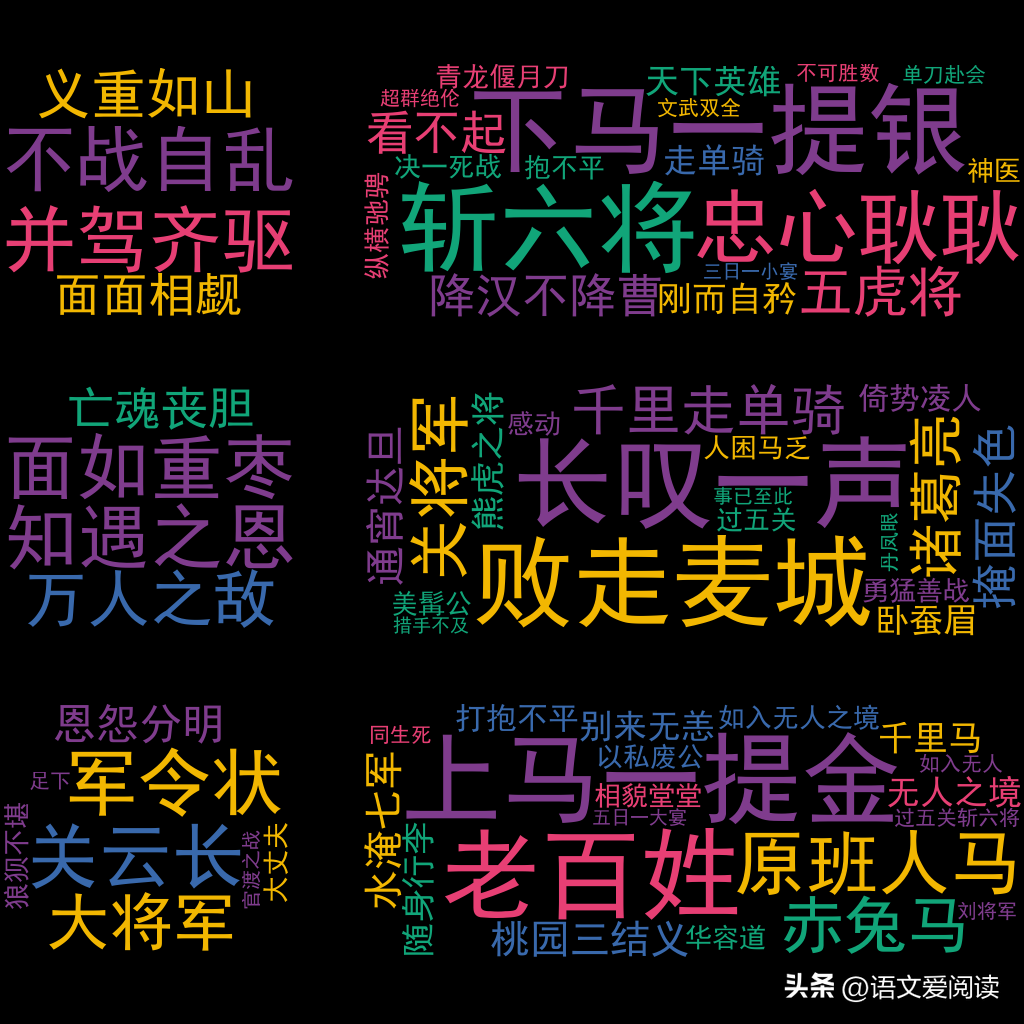 其他词(161个):/三日一小宴,五日一大宴/上马一提金,下马一提银/如入无人之境/过五关斩六将/千里走单骑/降汉不降曹/桃园三结义/青龙偃月刀/并驾齐驱/措手不及/忠心耿耿/人困马乏/文武双全/超群**/决一死战/单刀赴会/知遇之恩/亡魂丧胆/恩怨分明/无人之境/别来无恙/万人之敌/掩面失色/原班人马/以私废公/义重如山/熊虎之将/倚势凌人/随身行李/刚而自矜/水淹七军/勇猛善战/败走麦城/不战自乱/事已至此/如入无人/丹凤眼/华容道/卧蚕眉/同生死/走单骑/刘将军/五虎将/关将军/赤兔马/关云长/麻痹/拉拢/劝阻/超群/堵截/背弃/把守/上马/俊杰/忠心/耿耿/恩怨/自居/马力/丧胆/轻敌/随身/华佗/神勇/英豪/会聚/风雷/论处/安歇/岂敢/老将/故旧/文武/出阵/知遇/乘势/虎将/打探/双全/秉烛/垂泪/神医/说合/将令/军法/入骨/黄忠/亡魂/自荐/约法/大敌/妻小/书后/人材/丹凤/忠义/乌头/文丑/敬服/深知/麦城/追杀/措手/空身/死战/马超/君臣/张辽/养赡/彭越/弩箭/倦色/印绶/华容/赴会/关帝/败走/故主/近臣/齐驱/委用/环中/伸臂/熊虎/馆驿/厚恩/倚势/久慕/刮骨/兵将/赤兔/曹公/封印/恃才/外宅/下邳/马良/户外/七军/挥鞭/箭毒/颜良/截住/程昱/凌弱/解县/掩面/单骑/别部/袁军/部众/封关/传看/食肉/提刀/木柱/汉寿/上药/一室/内门