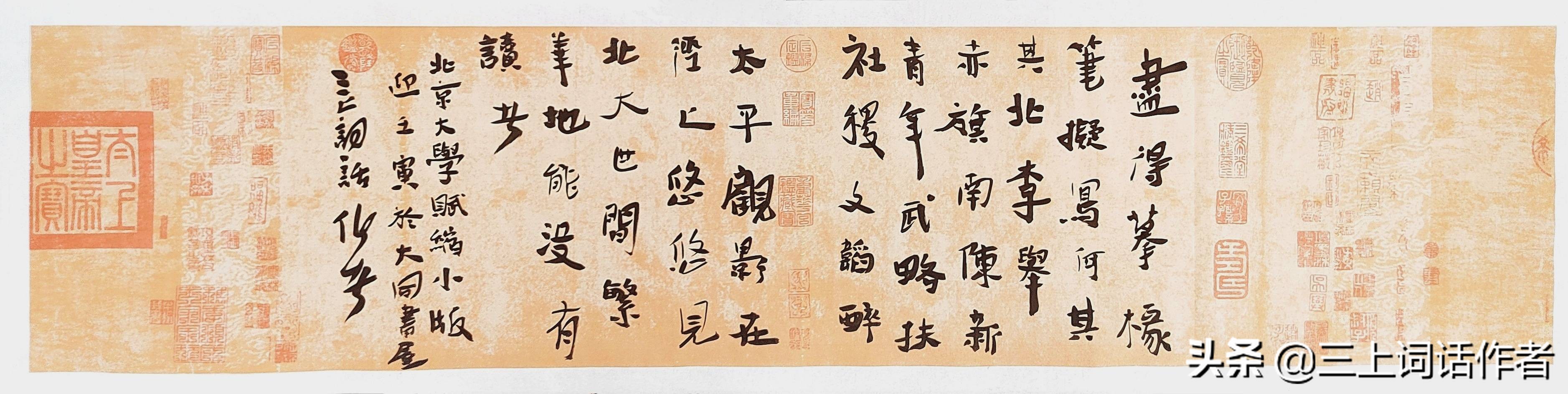 历数为六朝古都之地,【六朝者,后燕、辽、金、元、明、清。】形胜以九域拱月之势,【形胜者,谓地理位置优越,地势险要。京畿之地,可谓众星拱月。[引证]黄山、黄河,长江、长城,九域受领,各向风派。】建校于戊戌仲夏之时。【戊戌仲夏:1898年7月3日(农历五月十五),清光绪皇帝批准了由梁启超代为起草的《奏拟京师大学堂章程》,标志京师大学堂正式创办。】趋向以山无常形为知,【山:无常形者,谓桑田沧海也。[引证]知:《说文》:“知,词也。从口,从矢。”徐锴系传:“凡知理之速,如矢之疾也,会意。”《荀子·正名》:“故知者之言也”,杨倞注:“知读为智。”古亦用智为知,郭店楚墓竹简《语丛四》:“母(毋)命(令)智(知)我。”知,有知晓、了解、听闻、认识、辨别、作为,有告诉、使知道之意:《易·干》:“知进退存亡而不失其正者,其唯圣人乎!”又《淮南子·说林训》:“故见其一本而万物知。”高诱注:“知,犹别也。”又《列子·仲尼》:“其徒曰:‘所愿知也。’”张湛注:“知,犹闻也。”又《公羊传·宣公六年》:“赵盾知之。”何休注:“由人,曰知之;自己知,曰觉焉。”所谓“知之为知之,不知为不知,是知也。”故,教化自觉,知字先行。】造就以水无常势为行,【水:无常势者,运动也。谓昨居河东,今立河西。[引证]行,《说文》:“人之步趋也。从彳从亍。凡行之属皆从行。”[清]段玉裁《说文解字注》:“人之步趋也。步,行也。趋,走也。二者一徐一疾。皆谓之行。统言之也。尔雅。室中谓之时。堂上谓之行。堂下谓之步。门外谓之趋。中庭谓之走。大路谓之奔。析言之也。引伸为巡行,行列,行事,德行。”班固《汉书·谷永传》:“以次贯行,固执无违。”又《诗经·大雅·常武》:“左右陈行,戒我师旅。”又[汉]司马迁《史记·陈涉世家》:“**、吴广皆次当行。”从哪儿来,到哪儿去。故,妆玉始成,行字跟进。】承接以人无常态为思。【常态,固定的姿态。[宋]秦观《寄孙莘老少监》诗:“白衣苍狗无常态,璞玉浑金有定姿。”思:《说文》:“恖,容也。从心、囟声。凡思之属皆从思。” [清]段玉裁《说文解字注》:“言曰从,视曰明,听曰聪,思心曰容,谓五者之德。”《诗·大雅》:“思皇多士。笺:愿也。《正义》曰:以意之所思,必情之所愿也。”又《诗·大雅》:“思齐太任。”又《谥法》:“谋虑不愆曰思。”[引证]人无常态为思,实为没有一劳永逸的事情。故,知与行,思而总结方善。】旷世以时过境迁于学,【旷世,当世没人比得上;当代所没有的。王国维《文学小言》七:“天才者,或数十年而一出,或数百年而一出……此屈子、渊明、子美、子瞻等所以旷世而不一遇也。”所谓学:《说文》云:“觉悟也。”[汉]张揖《广雅·释诂四》:“学,教也。又[南朝梁陈]顾野王《玉篇·子部》:“学,受教也。”又[南朝梁陈]顾野王《玉篇·子部》:“学,觉也。”[引证]故学字为教授、受教、觉悟。教授、受教是环节,得到要领,觉悟才是目的。】维新以高等教育之问,【维新:指改变旧法推行新政。《诗·大雅·文王》:“周虽旧邦,其命维新。”毛传:“乃新在文王也。”陈奂传疏:“维,犹乃也;维新,乃新也……言周至文王 而始新之。”后因称改变旧法推行新政为维新。[清]黄遵宪 《流求歌》:“一旦维新时势异,二百馀蕃齐改制。”此维新,主旨以康有为、梁启超为代表的维新派人士通过光绪帝进行倡导学习西方,提倡科学文化,改革政治、教育制度,发展农、工、商业等的资产阶级改良运动。即戊戌变法后对教育方式和内容的改变,以经及运行影响和反映。[引证]问:《说文》云:“讯也。”又《礼记·学记》:“善问者如攻坚木。”由此,问字可引申出论难、考察、寻访、探望等含义。故,既要有学,又要有问,这样的学问才是活水泛舟的学问,不是枯树野蒿的单词。】相集京师大学堂为期。【京师大学堂:是北京大学前身。戊戌变法的“新政”之一,是**近代**所国立大学 ,创办之初也是****教育行政机关。为期:如期。即北大创办于1898年7月3日。】别致以峰回路转索句,【别致:别出心裁,新奇有致之意。[引证]北魏郦道元《水经注·桓水》:“斯乃玄之别致,恐乖《尚书》因桓之义。”峰回路转:山峰、道路曲折迂回。索句:指作诗时构思佳句,索取诗句。[宋]范成大《再韵答子文》:“肩耸已高犹索句,眼明无用且翻书。” [元]萨都剌《复次前韵柬龙江上人》:“山中酒熟黄鸡肥,闭门索句何瑰奇。” [明] 陈汝元 《金莲记·就逮》:“相公尽日题诗,本欲名山之贮。连年索句,宜为学海之藏。”】敷文以云度弦歌风绪,【敷文:铺叙文辞。指作文。[南朝宋]谢灵运《山居赋》:“研书赏理,敷文奏怀。”弦歌:依琴瑟而咏歌。《周礼·春官·小师》:“小师掌教鼓鼗、柷、敔、埙、箫、管、弦、歌。”郑玄注:“弦,谓琴瑟也。歌,依咏诗也。”又《史记·孔子世家》:“三百五篇,孔子皆弦歌之。”又[元]李治《敬斋古今黈》卷一:“古《诗》三百五篇,皆可声之琴瑟。咏其辞,而以琴瑟和之,所谓弦歌也。古人读诗皆然。”风绪:风。[唐]郑谷《漂泊》:“槿坠莲踈池馆清,日光风绪淡无情。”】转徙以北京大学训仪。【转徙:辗转迁移。1937年7月7日,卢沟桥**爆发后,9月,国立北京大学迁至长沙,与国立清华大学、天津的私立南开大学组成国立长沙临时大学。1938年,临时大学前往昆明,4月2日更名为