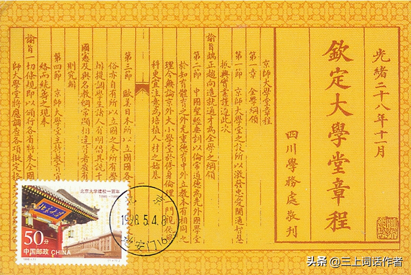 于是壬子孟夏,【即1912年5月15日(农历三月廿九)。】北京大学冠名而国立,【称谓,即国立北京大学。】听蒸汽笛鸣催发,【蒸汽笛鸣:火车的诞生和施用。1804年,由英国的矿山技师德里维斯克利用瓦特的蒸汽机造出了世界上**台蒸汽机车,时速为5至6公里。因为当时使用煤炭或木柴做燃料,所以人们都叫它“火车”,于是一直沿用至今。催发:比喻词。催促出发。[宋]柳永《雨霖铃》词:“都门帐饮无绪,留恋处、兰舟催发。”】戒醉骑逍遥之类。【戒:《说文解字·廾部》:“戒,警也。”《荀子·儒效》:“家富而愈俭,胜敌而愈戒。”这里指改变旧习。醉骑逍遥之类:诸如改变乘用牛车、羊车等习惯。比喻摒弃落后的东西。】倡研究高深学问,【蔡元培先生在就任北京大学校长时发表就职演说时, 讲述大学精神之一为“抱定宗旨”。指出大学的性质“大学者,研究高深学问也。”】做科学救国之事。【**近代科学的奠基人之一,**学者、教育家和思想家任鸿隽曾提出“科学救国之事”的话,亦可谓是“科学救国”的先驱。】“循思想自由原则,取兼容并包之义”。【教育家蔡元培先生提出的学术主张和办学方针,强调不论何种学派,“苟其言之成理,持之有故,尚不达自然淘汰之命运者,虽彼此相反,而悉听其自由发展。”(《致“公言报”函并附答林琴南君函》) [引证]所谓寸有所长,尺有所短。“思想自由”是挖掘潜力和启迪智慧的思维方式,“兼容并包”是兼纳和开明的行为做法。关键是稀罕长(cháng)者,长(zhǎng)者包容,凡有所望,我必育之;凡有所长,我必用之;凡有作为,我必有之。】开选科以文理,【文理:即所实行的一种教育制度,即将教学分为文科和理科,采取分别教育的方式。】分学科于专精;【按照学问的性质,依据学术的性质而划分的科学门类,精通所学科目。】尊格物以致知,【格物致知:“物格而后知至,知至而后意诚,意诚而后心正,心正而后身修,身修而后家齐,家齐而后国治,国治而后天下平。”([西汉]戴圣《礼记·大学》)后人由“致知在格物,物格而后知至”引申出成语“格物致知”。格:推究;致:求得。穷究事物原理,从而获得知识。[引证] 格物致知,指的是一种实践精神,从而证明的是一种学贵力行,行贵体悟,行而致知,知而促行,循序渐进,方能诚意正心。只有培育修齐治平品格,才能造就经世致用人才。】悟知来于忽焉。【知来:“见出以知入,观往以知来。”(《列子·说符》)即看见外表就可以知道内里,观察过往就可以预知未来。忽焉:快速貌。《论语》:“颜渊喟然叹曰:‘仰之弥高,钻之弥坚,瞻之在前,忽焉在后。’”[引证] 没有无缘无故的天之骄子,只有充分准备的厚积薄发。】妙万物以达观,【达观:泛指畅通,谓心胸开朗,见解通达。出自《尚书·召诰》:“ 周公朝至于洛 ,则达观于新邑营。” [晋]陆云《愁霖赋》:“考幽明于人神兮,妙万物以达观。” [引证]此偏向遍览、纵观之意多矣。《魏书·阳尼传》:“彼八方之局促兮,殊无可以达观。”】纵浪大于化中;【[晋]陶渊明《形影神三首》之“神释”:“纵浪大化中,不喜亦不惧。”[引证]顺应自然,以达观的态度看待一切事物变化。】秉道法以自然,通大道于方圆。【道法自然是老子学说的精髓,出自《道德经》第二十五章:“人法地,地法天,天法道,道法自然。”故与“通大道于方圆”句,联系起来理解,方可通达。《管子·形势解》:“以规矩为方圜则成,以尺寸量长短则得。” [引证]方圆是事物的形体、性状,行为和规范是处世之道与做人之本。】涉四海以潮涌,踩坚船于属意;【跨海洋时记坚船的厉害,即鸦片战争,1840年(道光二十年),英国政府以林则徐的虎门销烟等为借口,决定派出远征军侵华。[引证]属意:意向集中或倾向于某人或某事。踩坚船于属意:泛指踩上坚船出海时,时刻想着有着属于我们同样的坚船,于是才有为中华民族而读书的决心。】告八荒以奋蹄,晓利炮于**。【教化民众,启发自觉,国力不强,军力不强,就会被动挨打。牢记1840年,船坚炮利的英国海军沿着广州一路北上,打到天津,经过多次的交火和清政府的懦弱协商,中英签订《南京条约》。[引证] 说明“告八荒以奋蹄”的迫切与及时。八荒:泛指周围、各地。四面八方遥远的地方,犹称“天下”。如《汉书·项籍传赞》:“并吞八荒之心。”颜师古注:“八荒,八方荒忽极远之地也。” 晓利炮于**:指读书为国强,时刻准备着催告有着属于自己的利炮,才能拒敌于千里之外。】取法典于启智,寓法理以通义;【喻京师大学堂首设“法律学门”,开**近现代大学法律专门教育之先河,启蒙法治思想。法理:法律的理论依据。《东观汉记·张禹传》:“明帝以其明达法理,有张释之风,超迁非次,拜廷尉。”又《隋书·裴蕴传》:“蕴亦机辩,所论法理,言若悬河,或重或轻,皆由其口,剖析明敏,时人不能致诘。”又,**《国情》:“以新约法为物,无吾侪管窥法理之馀地。”通义:释义为普遍适用的义理;疏通大义。《孟子·滕文公上》:“治于人者食人,治人者食于人,天下之通义也。”又《汉书·卷三十六·楚元王刘交传》:“天地之常经,古今之通义也。”】信辣手以著文,担道义于铁肩。【明代大臣杨继盛有“铁肩担道义,辣手著文章”联句。**有“铁肩担道义,妙手著文章”语。[引证]“道义”是义理;“妙手”是方法;“文章”是立说;“铁肩”是行为。[引证]责任