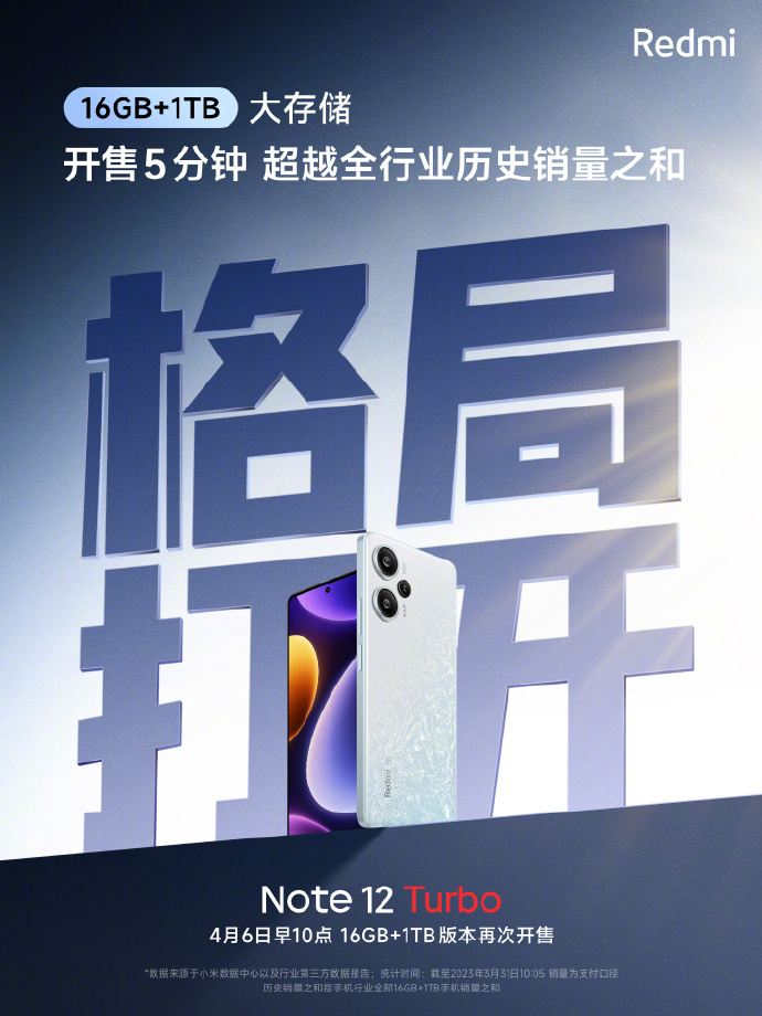Redmi Note 12 Turbo 手机 16GB 1TB 版本开售五分钟,超全行业历史销量之和。4 月 6 日早 10 点,16GB 1TB 版本将再次开售。