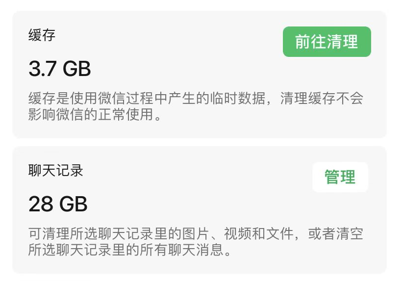 进入 “ 我 - 设置 - 通用 - 存储空间 ”,可以选择** “ 缓存 ” 和 “ 聊天记录 ” 这两大类。