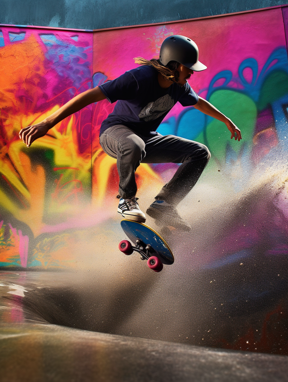 Prompt: An adrenaline-pumping action shot of a surfskater carving through a vibrant, graffiti-covered skatepark, showcasing their fluid movements and unique riding style. --ar 3:4 --q 1 --v 5 --v 5