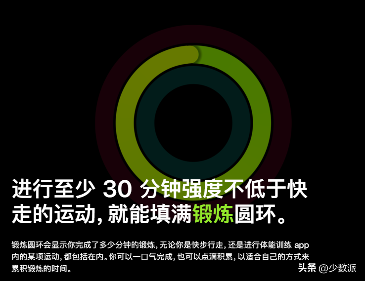 不管是大家想要**地减脂还是想要保持健康,中等强度的运动对大家来讲都至关重要,所以现在的智能手表多会统计我们一天当中的中等强度活动时间。比如苹果手表的三环,其中黄色圆环用来评价每天的中等强度用时。至少进行 30 分钟强度不低于快走的运动,才能填满锻炼圆环。