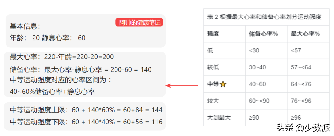 其实方法也很简单,我们可以先用**心率减去静息心率得到储备心率,再将运动时的心率除以储备心率,进而评价运动强度。为了让大家更好的理解这种计算方式,下面我给大家举一个例子,比如我们要计算阿帅的中等运动强度区间对应的心率: