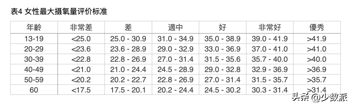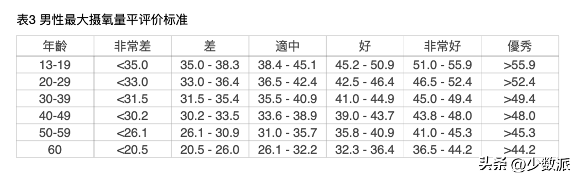 对于未经训练的健康男性 V?O(2)max **值约为 35–40 mL/(kg·min),未经训练的健康女性平均 V?O(2) max **值约为 27–31 mL/(kg·min)。具体会因为年龄不同,而评价标准不同而有所不同。具体可以参见以下的评价标准,但是需要注意的是此标准是以美国人为基础测量获得。