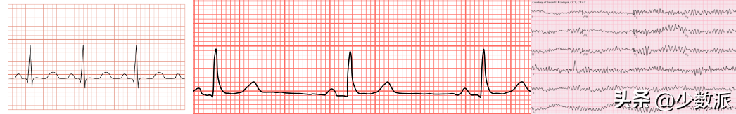从左到右是心动过速、心动过缓以及心率不齐的心电图,图片来源**百科
