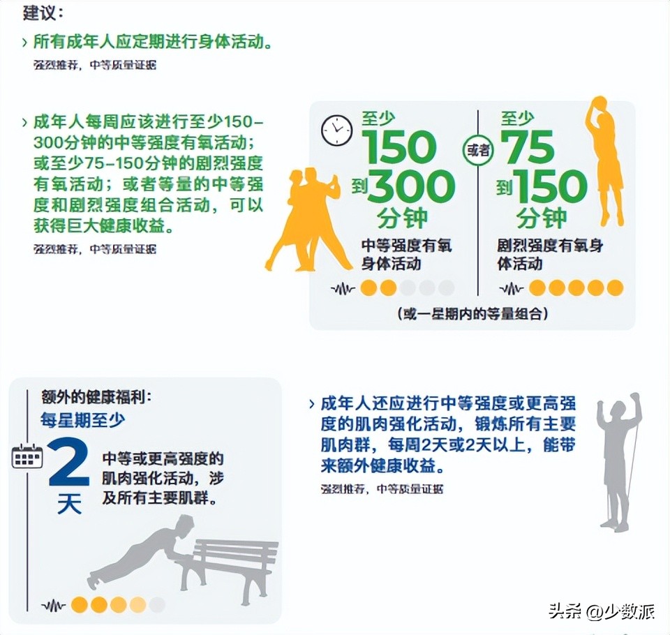 现如今,久坐是病,那么何药可治?答案是运动,运动是良药(Exercise is Medicine)。运动就是减少久坐危害的良药。既然是药,「服药」就要讲剂量。像走路这种运动,强度太小,药力不足。想要有效就需要中强度甚至是高强度运动。世界卫生组织给出的运动**是:推荐所有成年人每周应该进行至少 150-300 分钟的中等强度有氧运动或者等量的中等强度和剧烈强度组合的运动。