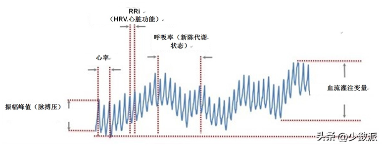 PPG 不仅仅能测量心率,还可以测量血氧饱和度、血压、呼吸率。下图是 PPG 信号可以获得不同生理指标的示意图。在获取不同的 PPG 指标时,会使用不同的波长。因为血红蛋白对红光的吸收更多,在测量血氧饱和度时,多选用红光以及近红外。但另一方面红光受运动的干扰比较大,所以在测心率时,则更多选用绿光。绿光也有缺点,绿光受汗液的影响比较大,因此在具体实践中,厂商多会联合使用多种光源测量心率、血压等参数。