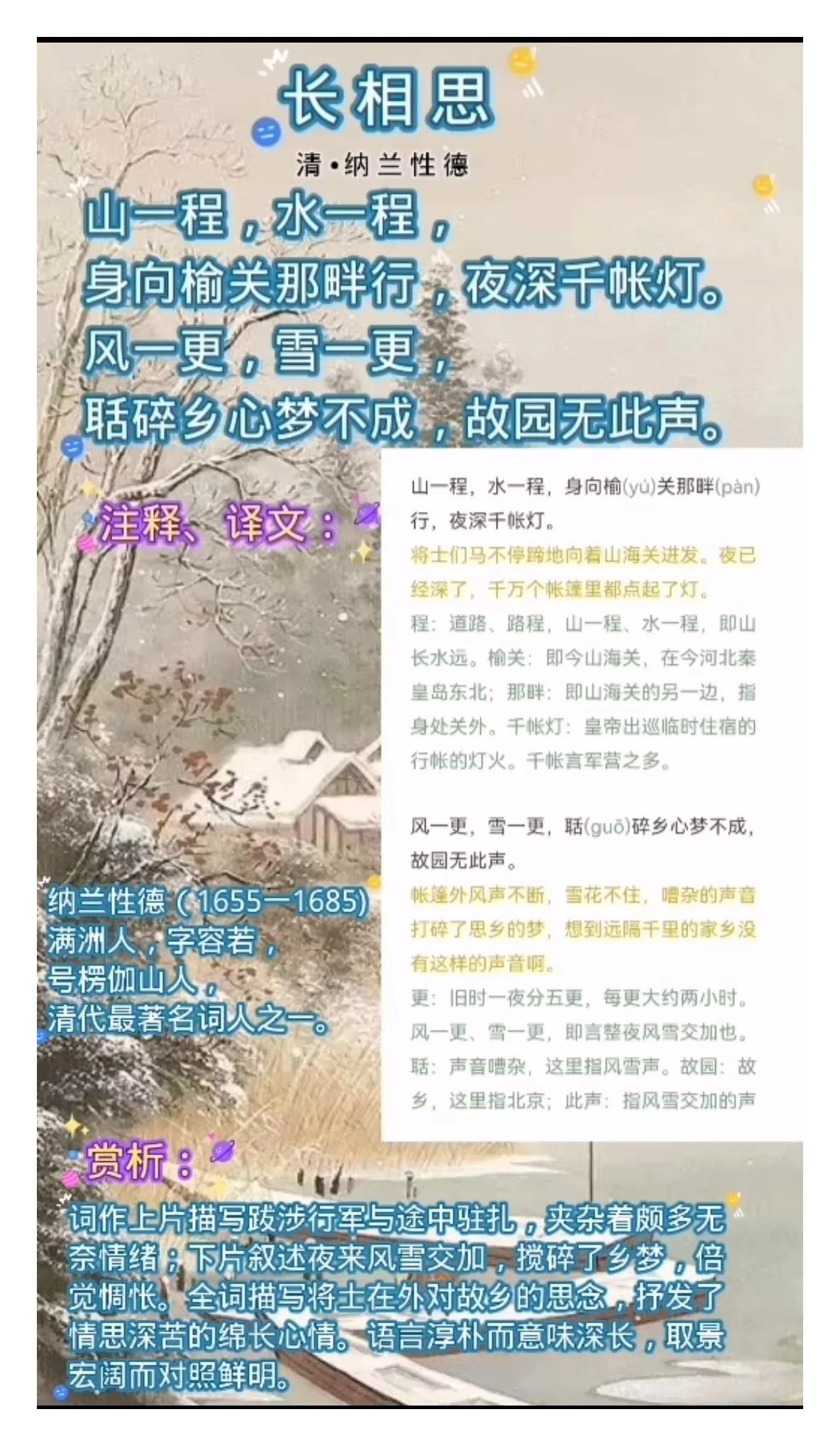 “山一程,水一程”,写出旅程的艰难曲折,遥远漫长。词人翻山越岭,登舟涉水,一程又一程,愈走离家乡愈远。这两句运用反复的修辞方法,将“一程”二字重复使用,突出了路途的漫漫修远。“身向榆关那畔行”,点明了行旅的方向。词人在这里强调的是“身”向榆关,那也就暗示出“心”向京师,它使我们想到词人留恋家园,频频回首,步履蹒跚的情况。“那畔”一词颇含疏远的感**彩,表现了词人这次奉命出行“榆关”是无可奈何的。