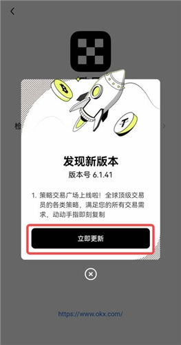 1、欧e虚拟货币交易平台新版本上线后,会在首页弹窗通知,您可以点击弹窗中的【立即更新】,下载安装**版本。