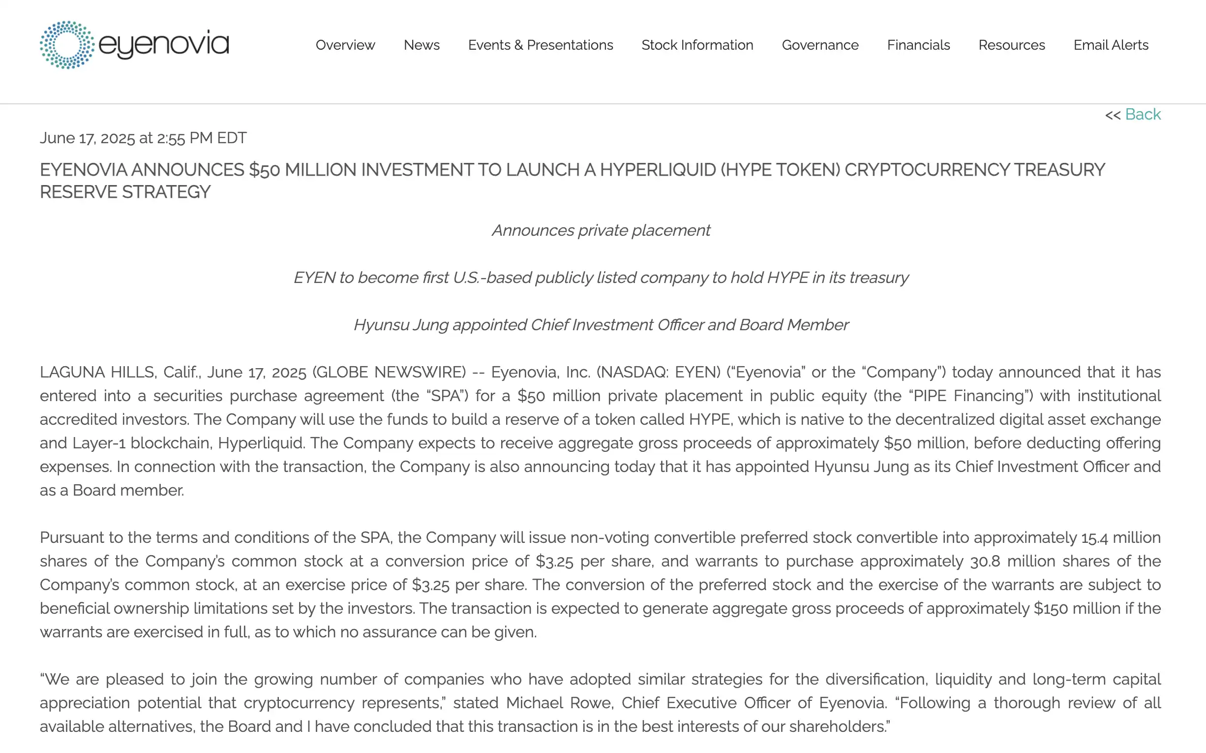 为推动这一战略转型落地,公司同步任命 Hyunsu Jung 为新任**投资官(CIO)兼董事会成员,并预告公司名称将更名为 Hyperion DeFi,股票代码亦将更新为 HYPD。而作为**使用链上交易所的**做「微策略」计划的美股上市公司 Eyenovia 究竟是什么?他的背后推手 Hyunsu Jung 又是谁?而现今越来越多的公司利用 Crypto 的**「重生」,$Hype 会是一个更好的选择吗?