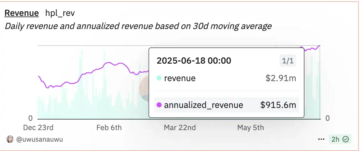 随着 Hyperliquid 近期的活跃,其主网的 TVL 已经跃升至公链前 10,而 $HYPE 市值也已跃升至所有加密货币第 11 名,其参与人数逐步上升,平台单日手续费能够维持在每日 200-300 万美元,平台年收入已经接近 1 亿美元。