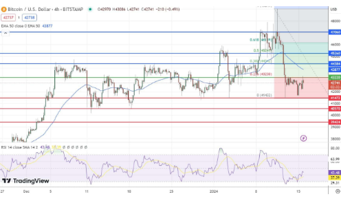 BTC/USD 货币对已在 42,692 美元处建立枢轴点,表示当前市场状态下的平衡点。比特币价格在 44,384 美元处遇到阻力,在 45,260 美元和 47,060 美元处进一步障碍。另一方面,支撑位确定在 41,472 美元、40,570 美元和 39,424 美元,作为防止潜在下跌的保障措施。相对强弱指数(RSI)目前为40,表明比特币处于中性状态,既不超买也不超卖,为潜在的价格变动留下了空间。位于 44,173 美元的 50 天指数移动平均线 (EMA) 略高于关键阻力位,可能会挑战看涨势头。