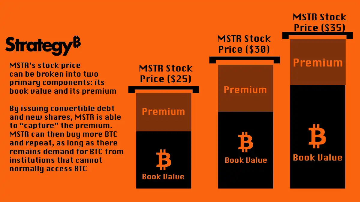 Strategy 的创始人兼执行董事长 Michael Saylor(@saylor)看到了这些实体在希望获得资产敞口与其实际能承担的风险之间的差异,并对此加以利用。在比特币 ETF 出现之前,$MSTR 是这些只能购买股票的实体获取比特币敞口的少数可靠途径之一。这意味着 Strategy 的股票经常以溢价交易,因为对 $MSTR 的需求超过了其股票的供应量。Strategy 不断利用这种溢价,即 $MSTR 股票的价值与每股所含比特币价值之间的差异,来购买更多的比特币,同时增加每股所含的比特币数量。