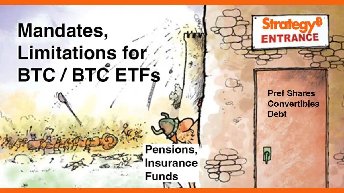 这是「授权套利」(Mandate Arbitrage)的典型案例。在比特币 ETF 推出之前,如前所述,许多市场参与者无法购买非交易所交易的股票或证券。然而,作为一家交易所上市公司,Strategy 被允许持有并购买比特币($BTC)。即使最近比特币 ETF 已经推出,认为这种策略不再有效是**错误的,因为许多基金仍被禁止投资 ETF,其中包括管理着 25 万亿美元资产的大多数共同基金(Mutual Funds)。