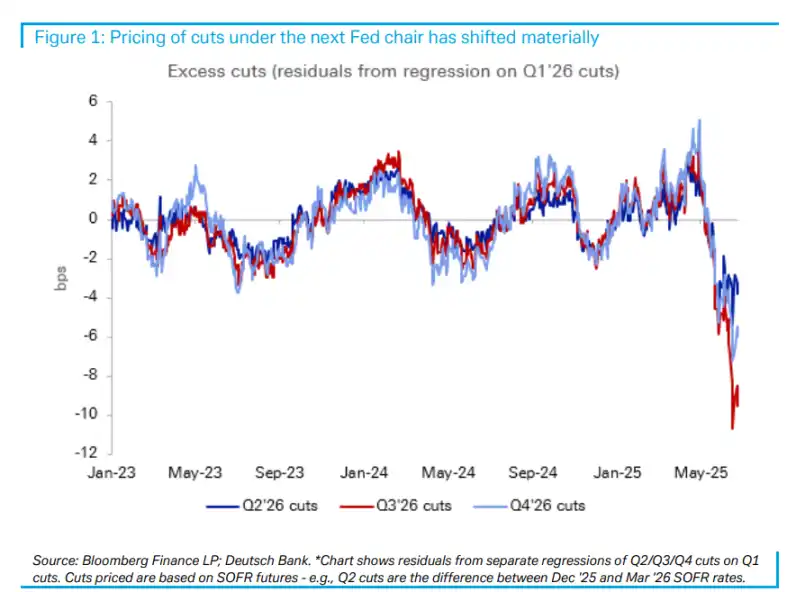 德意志银行发现,过去一个月,这些残差显著转负,特别是 2026 年第三季度——正值新主席上任期间。这表明市场正在为新主席任期内的异常程度宽松政策定价,这种定价模式偏离了近年来的历史常态。