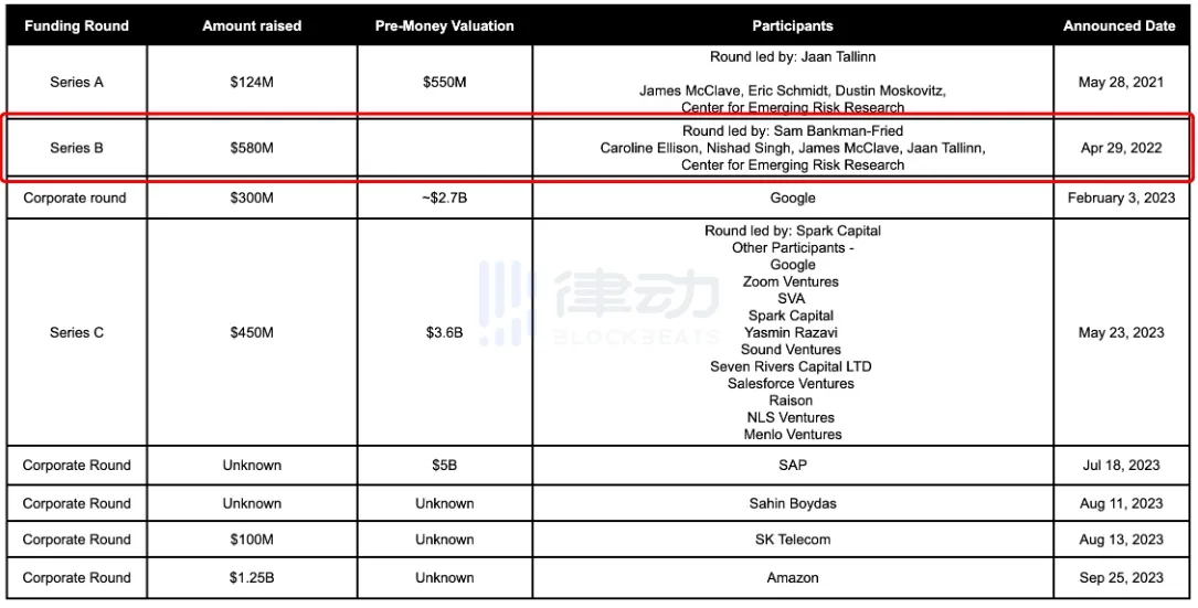 Anthropic,由前 OpenAI 高管创办,聚焦 AI 安全,SBF 亲自注资 5 亿美元,持有约 8% 股份。