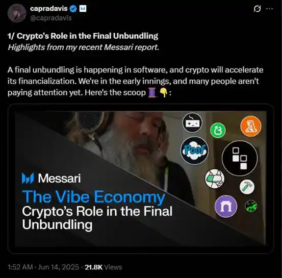 对于开发者来说,vibe coding 目前可能还只能是工作效率层面的提升,但在币圈,这是又一次「内容制作」层面的解放。是的,如果不把 vibe coding 看成制作程序,而把其视作一种内容创作,它在币圈的潜力就会很大。