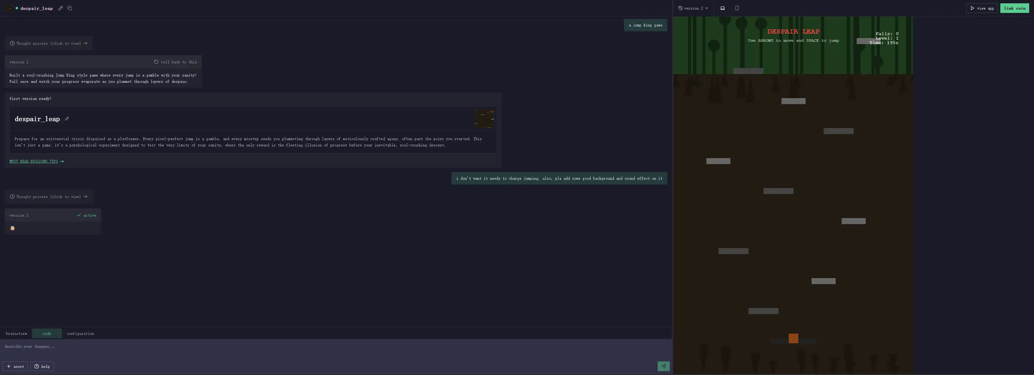 我支付 0.01 SOL 后让平台对这个初始版本进行修改,提出了 3 个要求,分别是添加背景、添加音效以及取消蓄力跳跃机制,这些要求都得到了满足。