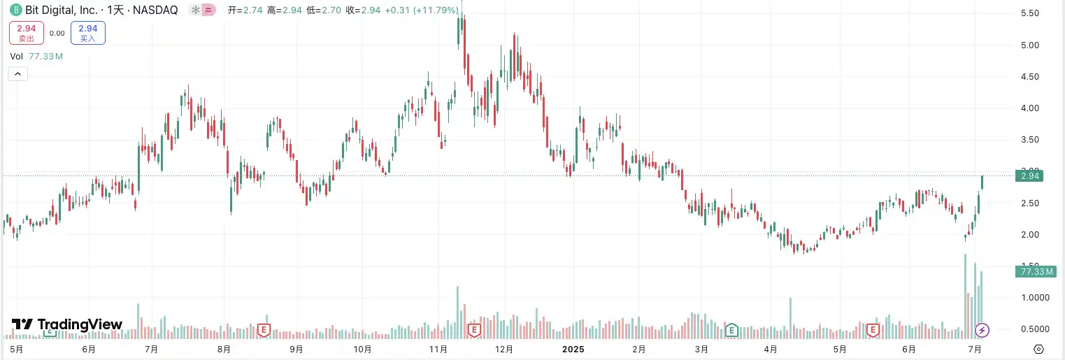 然而,在完成 1.5 亿美元公开募股后,Bit Digital 股价一度暴跌 15%,五日内累计下跌 19%,反映出市场对其弃比特币业务的担忧。但随着 BitMine 领衔的「以太坊微策略」在七月初集体发力,BitDigital 股价迅速反弹 50%,已收复先前所有跌幅。