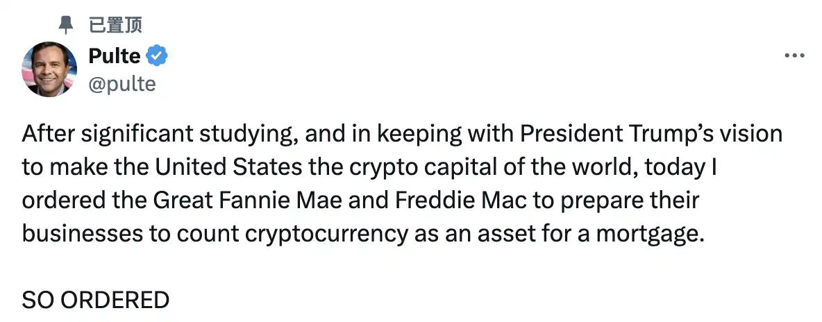 在特朗普**任期内,利益相关者曾讨论了各种 GSE(政府资助企业)改革方案,但未取得**立法进展,而 Pulte 之所以在推文中用「命令」的语气,是因为他作为 FHFA 的主席在这两家公司中担任「监督」的董事会职位,且在 2025 年 3 月上任后便进行了大刀阔斧的人员与架构改革,调离两大机构多名董事,自任董事会主席,并解雇 14 名高管,包括房地美的 CEO,进行**重组,这让 FHFA 对 GSE(政府资助企业)的掌控权显著增强,并与白宫及财政部协商,探讨带有「隐性担保」基础上的公开上市方案,其政策动向对金融体系具有深远影响。如今,FHFA 开始探索将加密资产纳入抵押**承销评估体系,标志着监管层对加密资产的态度正发生结构性转变。