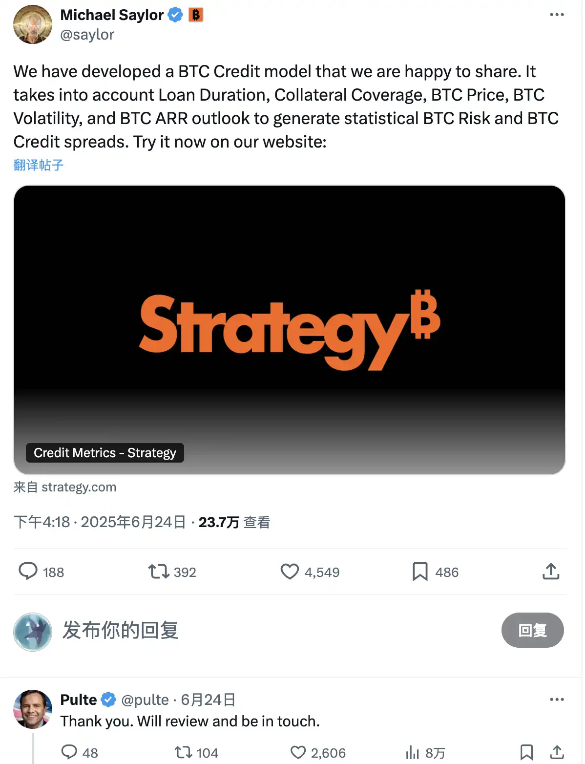 在基础设施上微策略也做了相应的贡献,他们开发了一套 BTC 信用模型,Pulte 直接在社交媒体 X 上表达了对其的兴趣。