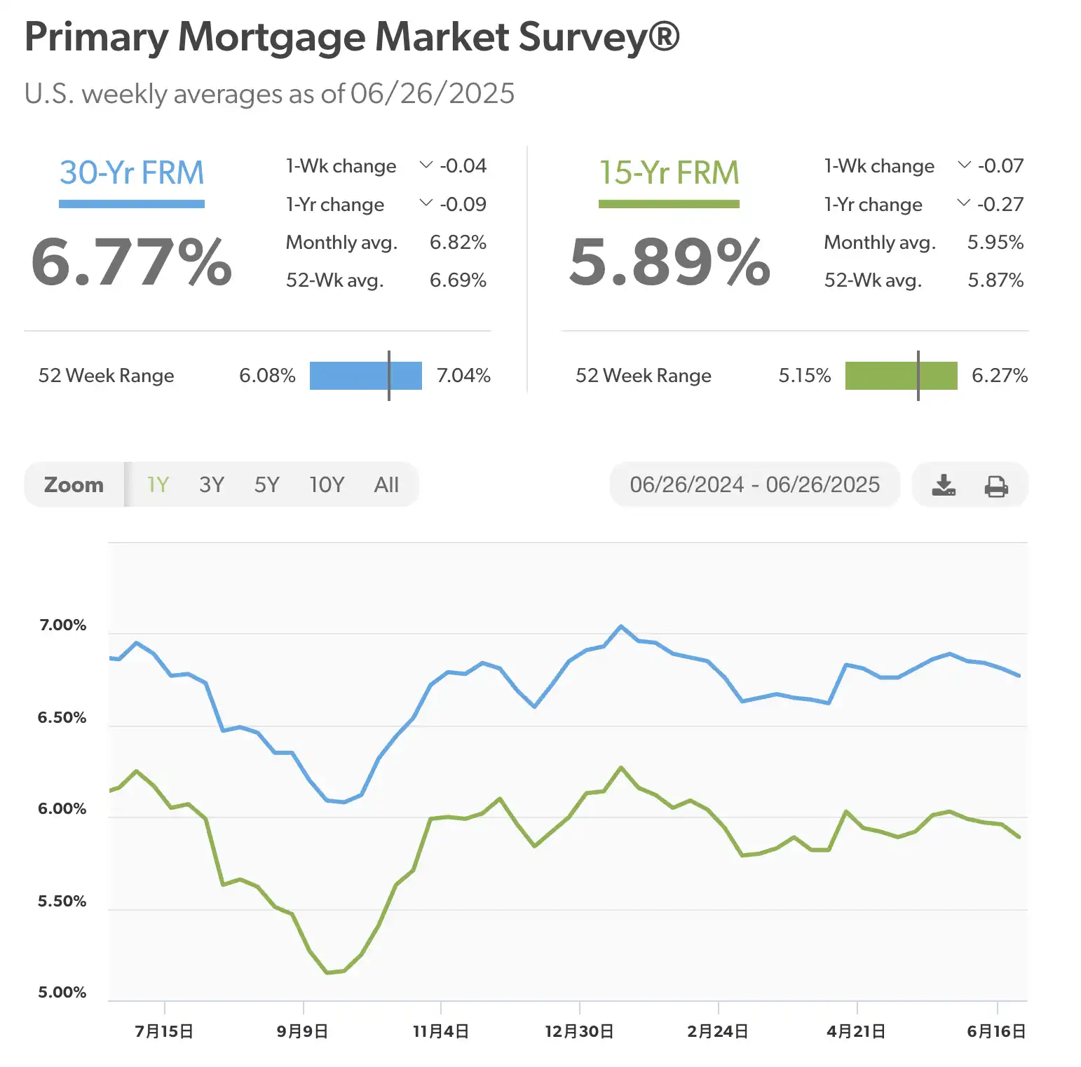 根据房地美提供的数据来看,当前美国 30 年期的抵押**年利率普遍在 7 % 左右浮动,而 15 年期的则在 6% 左右浮动。