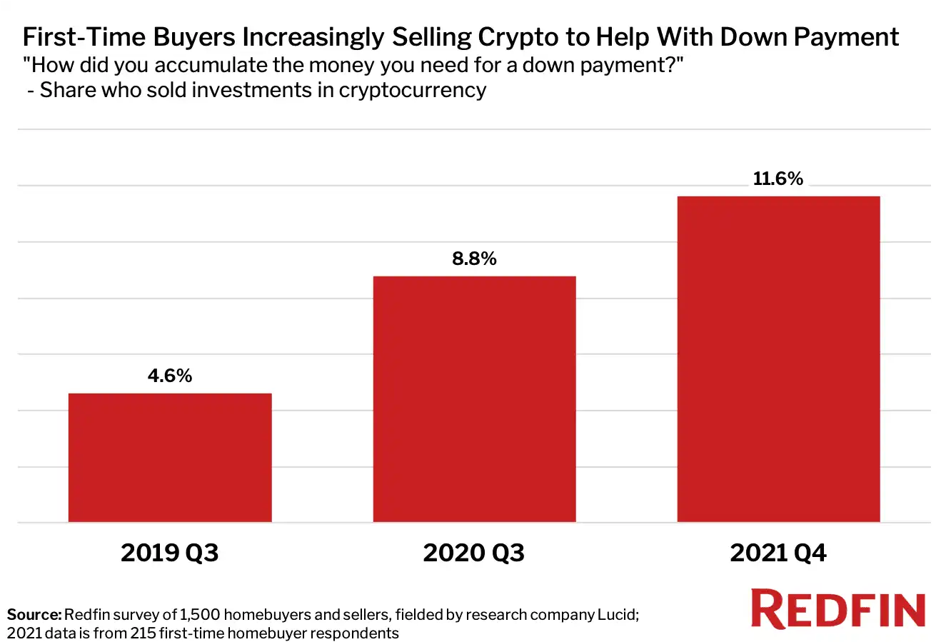 美国房地产经纪公司 Redfin 的**经济学家 Daryl Fairweather 表示「由于时间充裕,又缺乏令人兴奋的消费方式,疫情期间许多人开始交易加密货币。其中一些投资化为泡影,但同时也使一部分人获得大量财富,或至少获得了足以支付房屋首付的水平。」
