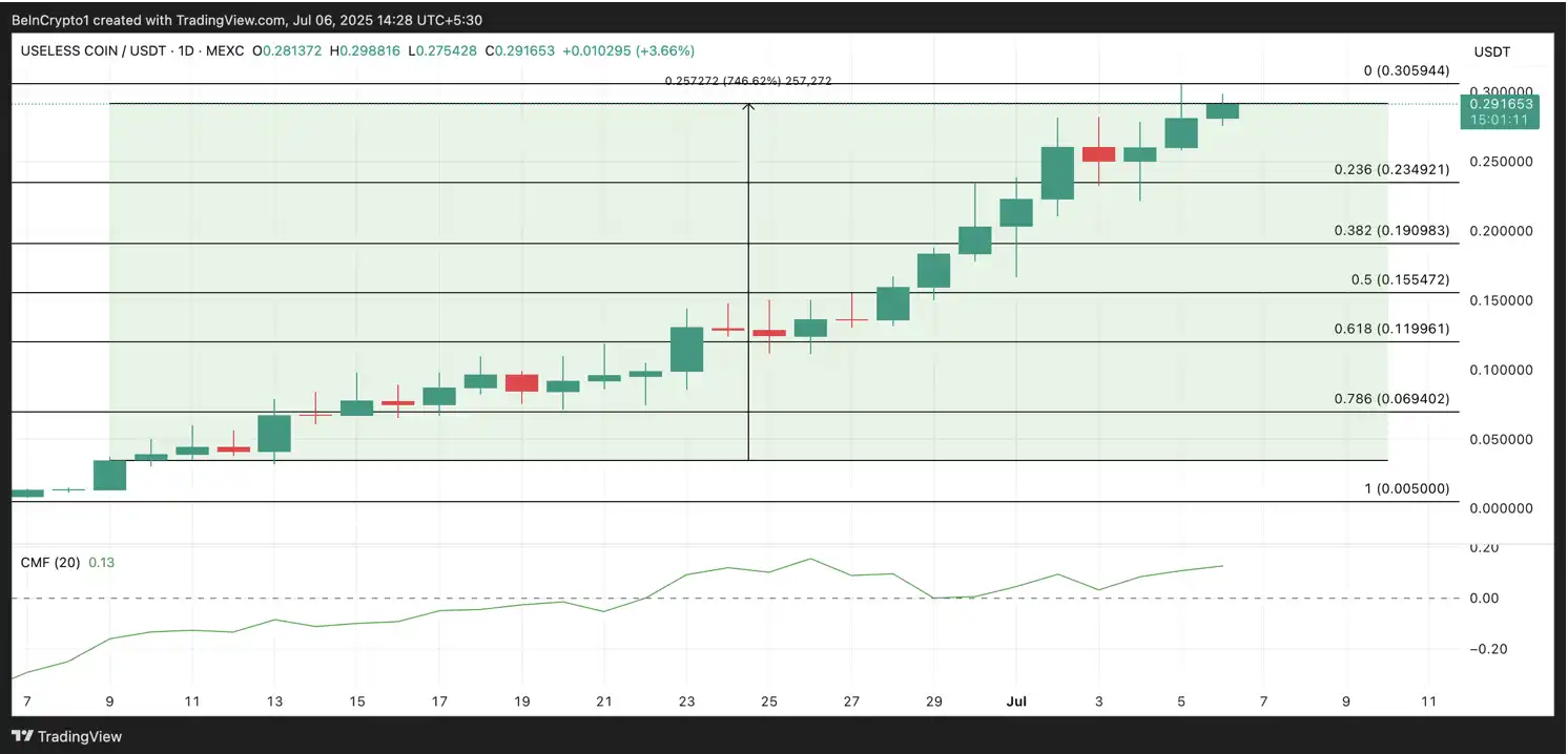 USELESS/USD 的日线图显示,这个 meme 币自 2024 年 6 月 5 日以来每天都创下新高。目前以 0.29 美元交易,USELESS 在过去一个月内价格上涨了 740% 以上。该**不断上升的柴金货币流动指标(CMF)证实了 USELESS 的价格上涨得到了显著买盘支撑。这个衡量资产资金流入流出的动量指标目前为 0.13 并持续上升。这样的正向 CMF 表明市场买盘压力强劲。如果买盘活动持续,USELESS 可能会重返历史**点 0.305 美元。