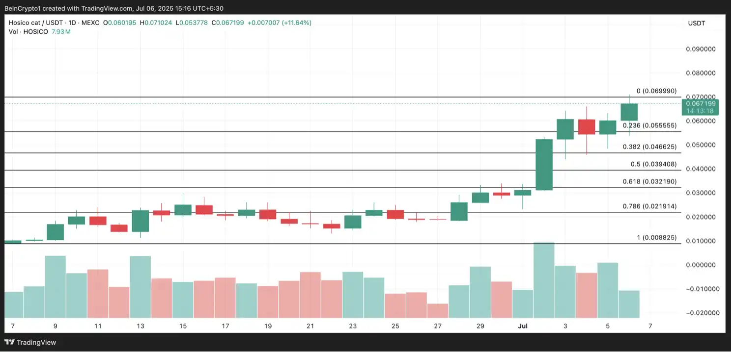 HOSICO 是 BONK 生态系统中另一个本周值得关注的 meme 币。过去一周上涨了 135%,目前交易价格为 0.067 美元。尽管更广泛的市场正在调整,HOSICO 在过去 24 小时内仍上涨了 16%。值得注意的是,这个山寨币今日短期内触及历史**点 0.069 美元。