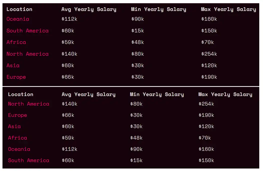 这一现象与传统行业薪酬紧缩形成鲜明对比。Web3 项目往往能够提供立竿见影的高额回报。根据Web3 Career的薪资统计数据,截至 2025 年 6 月,即便是初级岗位,年薪也普遍不低于 5 万美元,约合人民币 35 万元(按 1 美元≈7.15 元汇率计算)。