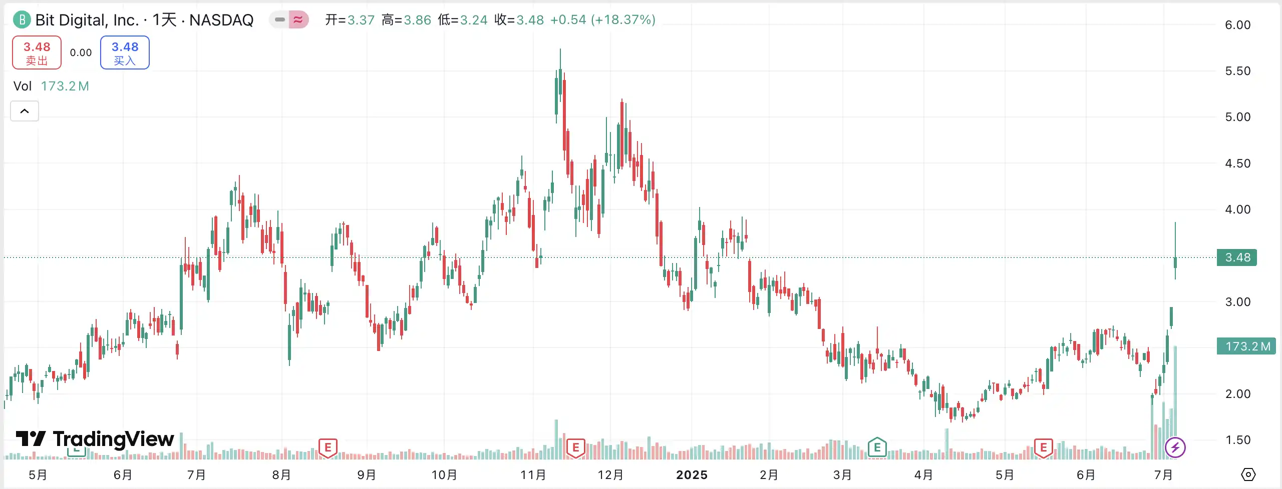 7 月 7 日,加密矿企 Bit Digital(股票代码:BTBT)做出了一个震撼市场的决定——出售 280 枚比特币持仓,将**加密货币资产转移至以太坊。这家曾靠比特币挖矿发家的公司,如今已持有超 10 万枚 ETH。消息一出,BTBT 当日股价大涨 18.37%,收于 3.48 美元。