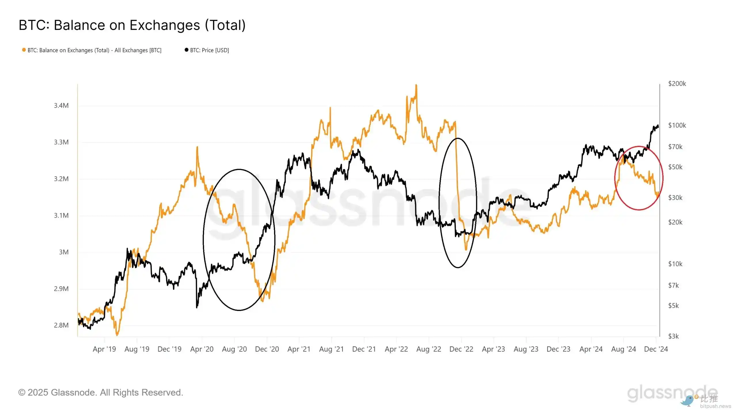 Glassnode 的数据也印证了这一趋势。在过去的五年里,比特币在交易平台的余额曾两次出现急剧下降,而每一次下降之后,都伴随着比特币价格的显著上涨。令人关注的是,自 2024 年 7 月以来,比特币在交易平台的余额一直在稳步下降。这表明,投资者正在将比特币从交易平台提取到私人钱包进行长期持有,市场抛压减小,如果历史重演,比特币的牛市运行还有进一步的空间。