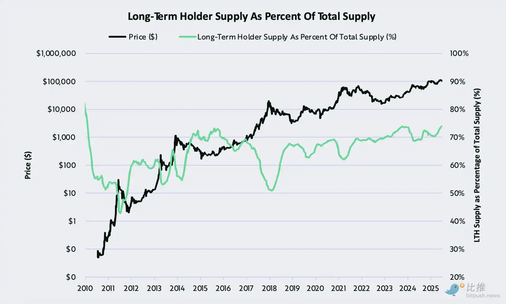 ARK Invest **发布的《比特币月度报告》指出,目前长期持有者持有的比特币总量已达到总供应量的 74%,这一比例创下了过去 15 年来的新高。这强烈暗示了经验丰富的投资者对市场的坚定信念和强烈看涨预期,他们选择在价格上涨之际继续囤积比特币而非出售,为市场提供了强大的支撑。