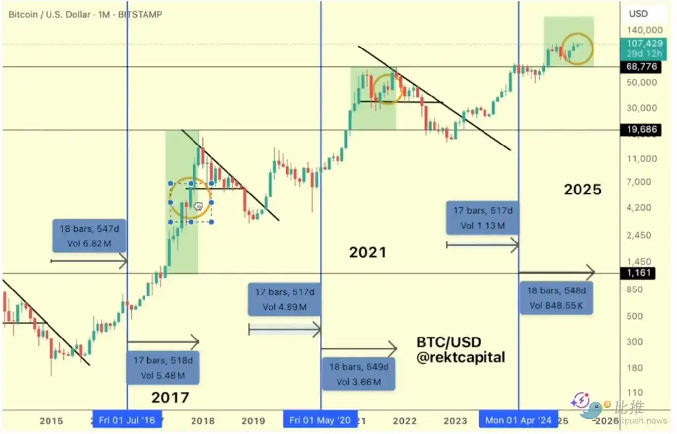 加密分析师 Rekt Capital 也指出,如果比特币遵循 2020 年的历史模式,本轮周期的价格扩张可能只剩下几个月,其价格可能在 10 月达到峰值,这距离 2024 年 4 月的比特币减半事件约 550 天。