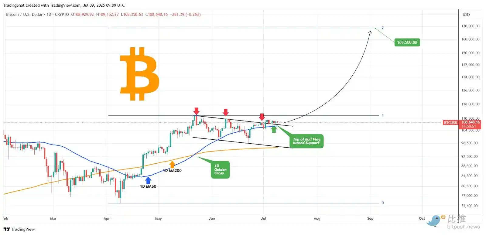 TradingShot 进一步预测,从这个「牛旗」的突破技术上指向 2.0 斐波那契扩展线,目标价可能达到 168,500 美元。