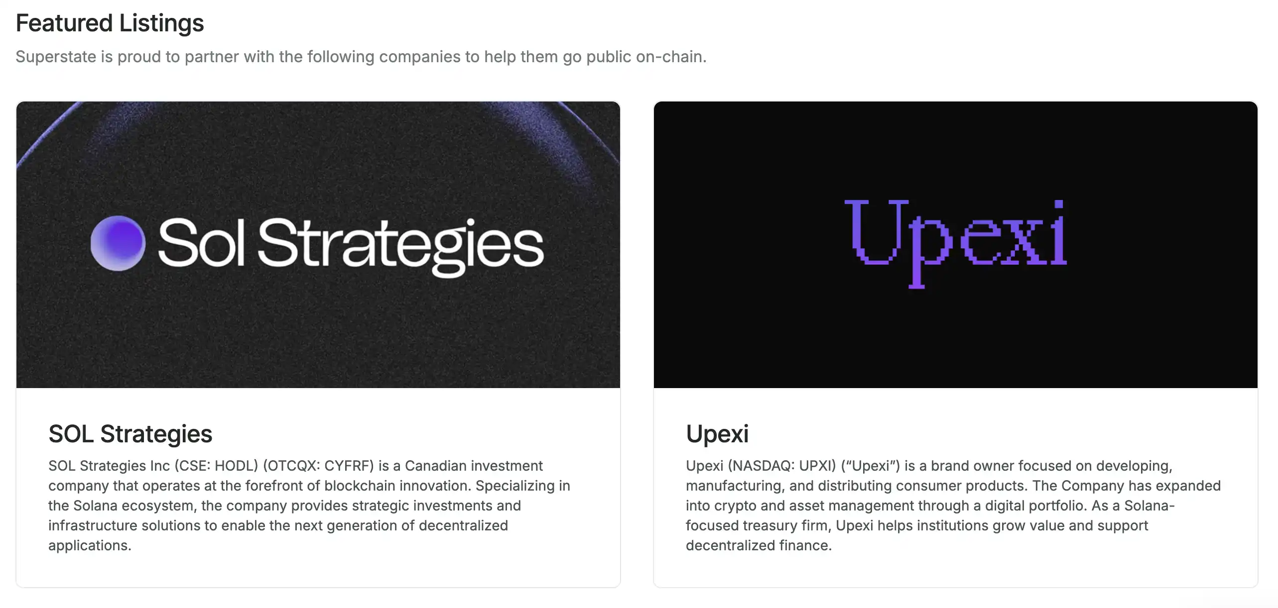 而事实上大部分「币股概念」的上市公司都遇见到了相似的困境,而 Upexi 与 SOL Strategies 借着近期「美股上链」的东风,率先开启链上股票策略与市场结构的转型。在 Superstate 推出 Opening Bell 后,SOL Strategies 这家加拿大上市公司曾宣布计划在纳斯达克上市,但在纳斯达克敲钟之前他们选择先在 Superstate「敲钟」,2025 年 5 月 8 日首先宣布将自家公司股票通过该平台上线,而待监管部门批准后,SOL Strategies 其股票将于今年夏天在 Solana 上交易。而紧随其后 Upexi 于 2025 年 6 月 26 日 宣布将通过 Opening Bell 平台**化股份,双方成为该平台的首批参与者。
