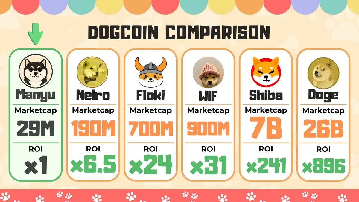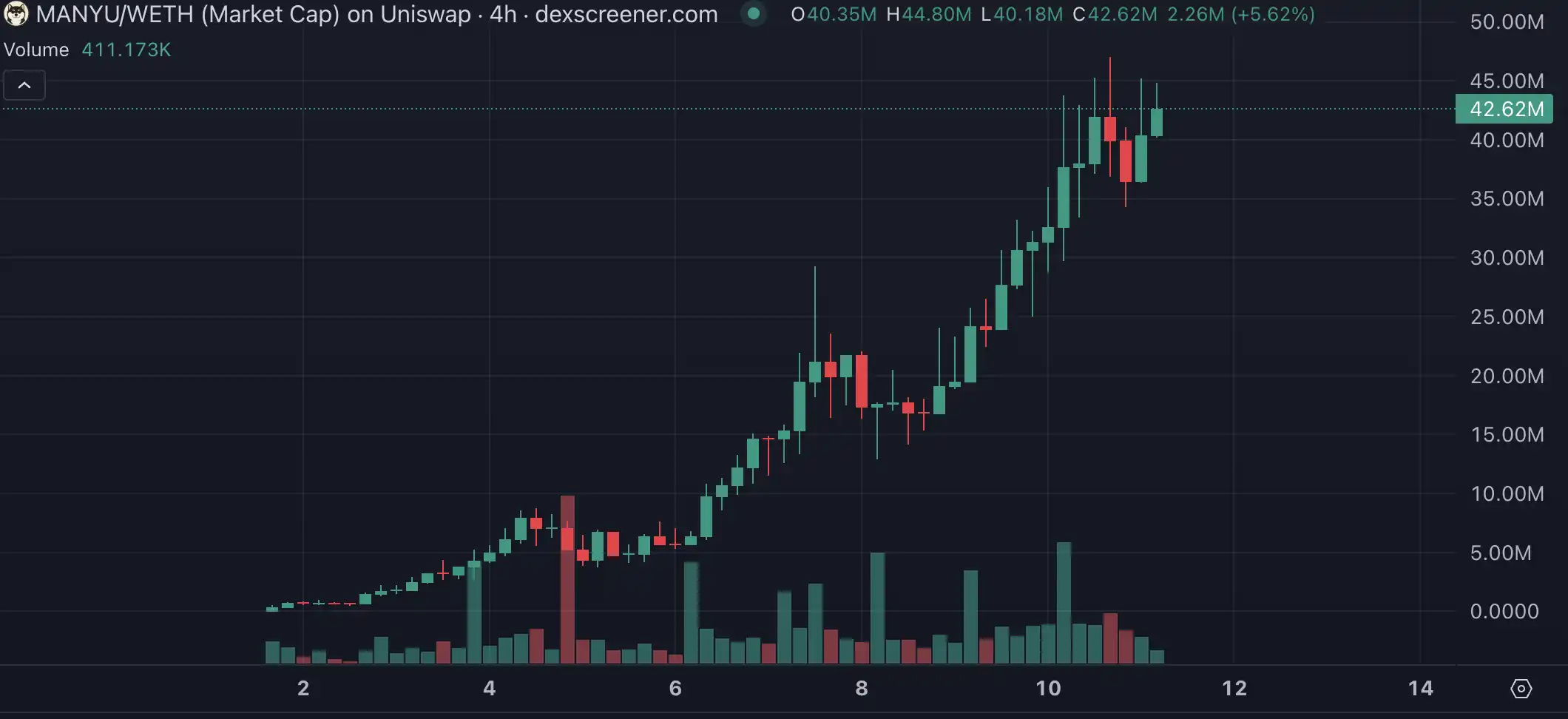 项目上线短短五天内,热度直冲 CoinMarketCap **,7 天涨幅高达 14 倍,目前市值已突破 4200 万美元,持币地址已超过 10,000 个,曝光量突破 70 万次。$MANYU 渴望通过「IP 社群 纯情绪驱动」的轻模式路线打造出继 $DOGE、$SHIB 之后最有潜力的柴犬新王者。