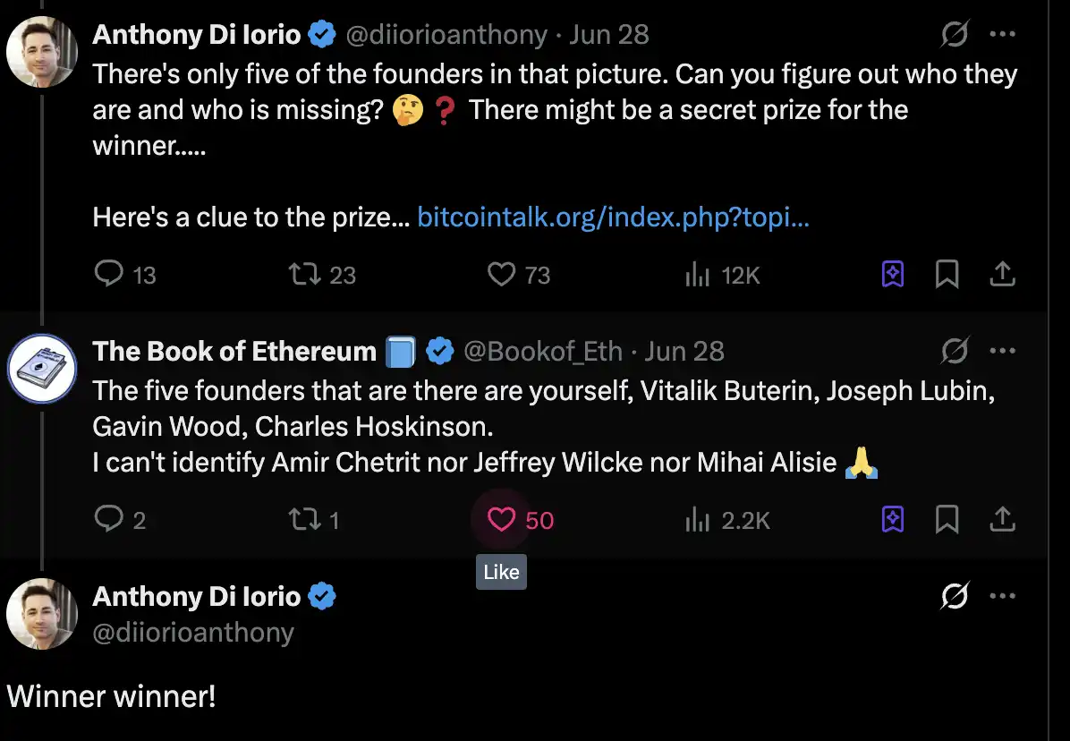 同时,该项目也受到以太坊生态核心人物的关注,最近爆火的以太坊微策略 SBET 的高管 Joseph Lubin 关注了 $BOOE 的项目推特。以太坊联创 Anthony 公开互动「Winner winner」对项目表示支持,令 $BOOE 在文化与资本双重维度上,具备了爆发前的**想象力。