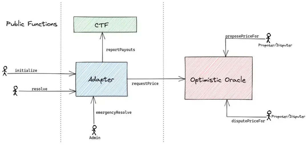 市场初始化时,CTF 适配器会自动向 OO 发送请求。UMA 系统中的提议者可以对此请求进行回应,如无争议,该回应会被视为正确,并在两个小时的挑战期后提交给 CTF 适配器。如果答案不正确,或 UMA 的其他参与者对此答案有异议,其他参与者可以作为争议者对该答复进行辩论。