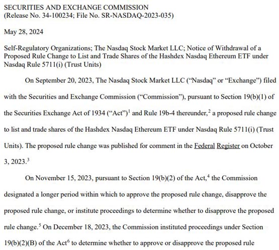 此前报导SEC在23日 批准八档以太坊现货ETF,但其中并不包括Hashdex,而据纳斯达克在28日发布的撤回通知,Hashdex已在24日撤回申请。