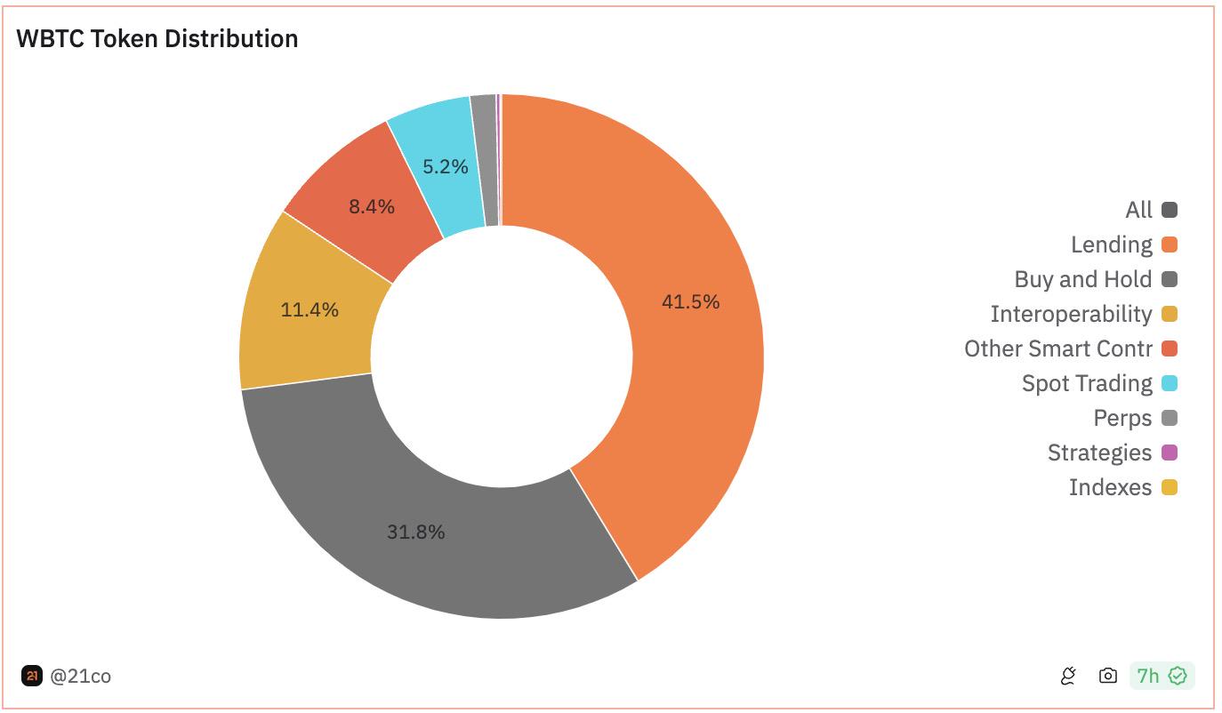 同时官网显示,截至发文,WBTC已铸造超15.4万枚比特币(价值超90.4亿美元),占比特币总市值的0.78%。从流通量来看,WBTC的供应量在2021年达到23.5万枚峰值后开始下滑,直至去年下半年开始逐渐回暖。从应用场景来看,Dune数据显示,截至8月12日,有近41.5%的WBTC用于借贷生态,近31.8%则用于直接交易。