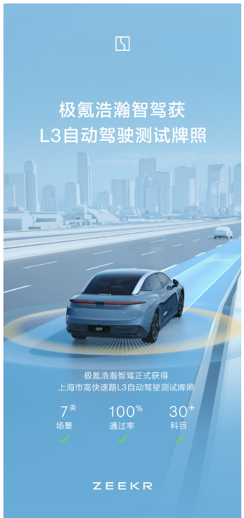 6月4日消息,极氪汽车今日在其官方微博宣布,极氪浩瀚智驾系统已成功获得上海市高快速路L3自动驾驶测试牌照。该系统在经过7类不同场景、30余项科目的严格测试后,以100%的通过率彰显了其**性能。