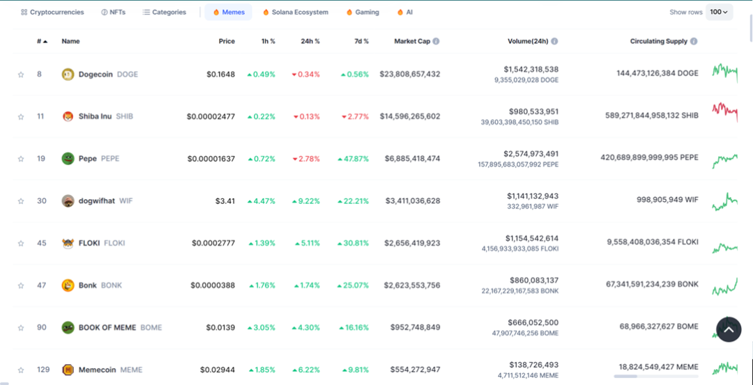 目前市值较高的一些 MEMEs,主要集中部署在 Ethereum 、Solana、Base、Bitcoin(BRC20等)等链上。