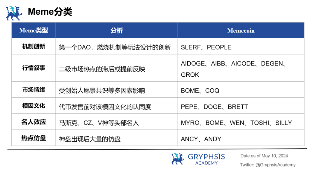 - MEMEs 在各周期以不同形式呈现,随着周期的变迁,其特点、机制等均不同。MEMEs **程度可以反应不同时期投资者的心态和市场热点,包含了对当下新技术的展望,以及叙事方向。