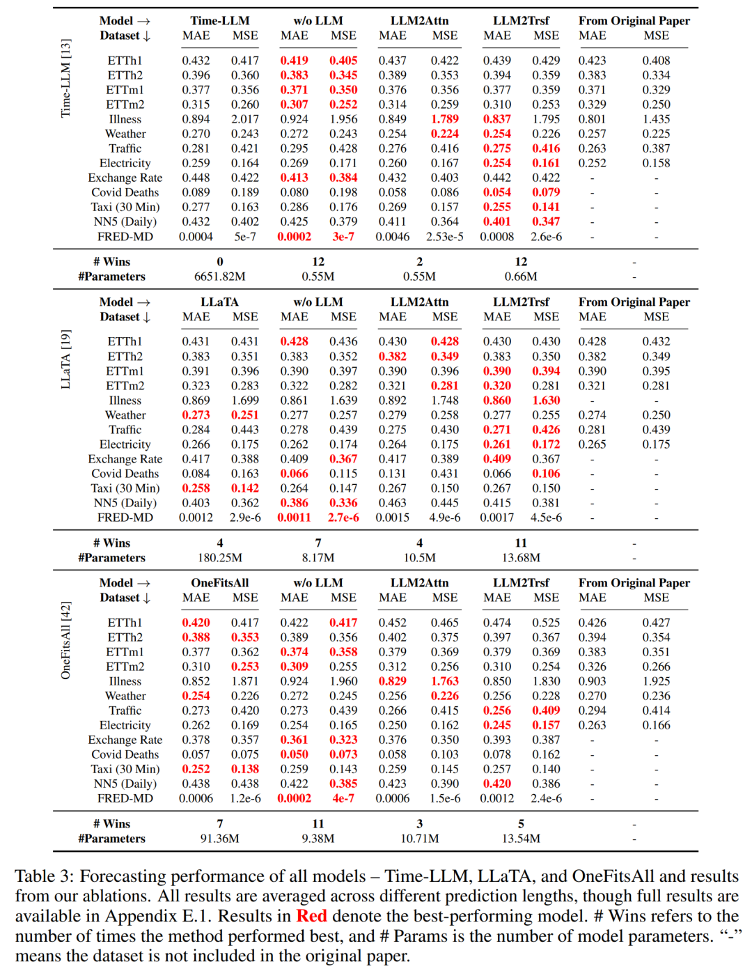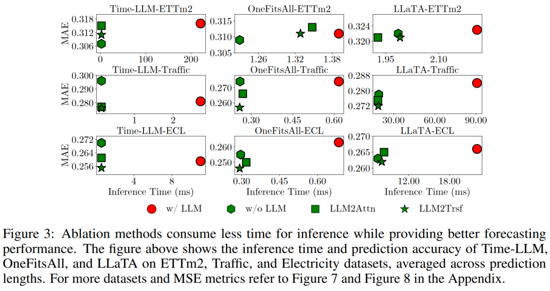 总体而言,如表 3 所示,在 8 个数据集和 2 个指标上,消融方法在 26/26 案例中优于 Time-LLM 方法,在 22/26 案例中优于 LLaTA,在 19/26 案例中优于 OneFitsAll。