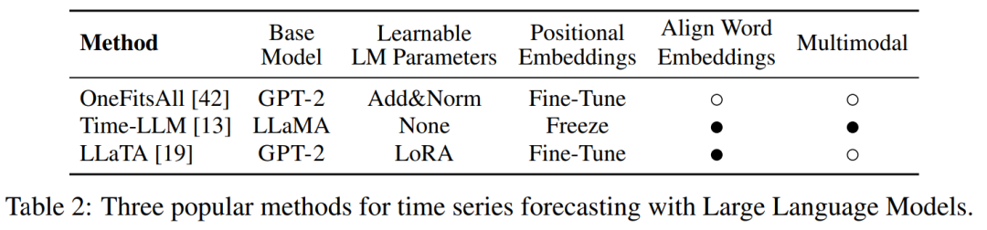 他们实验了三种近期的使用 LLM 进行时间序列预测的方法。见表 2,这些方法使用的基础模型为 GPT-2 或 LLaMA,同时使用了不同的对齐和微调策略。