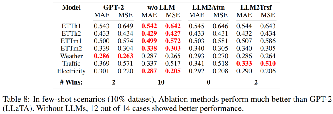他们的评估实验是取用每个数据集的 10%,再训练模型及其消融方法。具体来说,这里评估的是 LLaMA(Time-LLM)。结果见表 7。