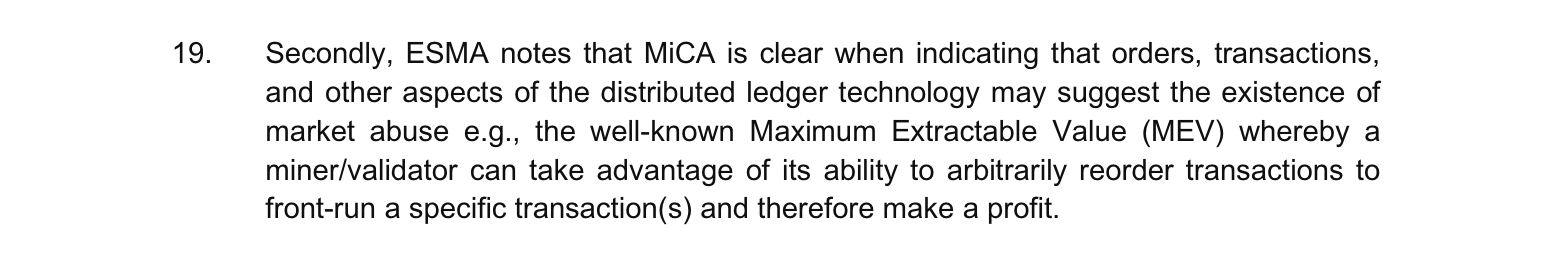 不过眼尖的律师Jonathan Galea认为,ESMA在其文档中指出的是,MEV「可能」暗示存在市场滥用的迹象,并特别提到了抢先交易,它并未表示这「明确表明存在市场滥用」。此外他也同意,要求交易所和经纪商报告所有MEV案例是不现实的。